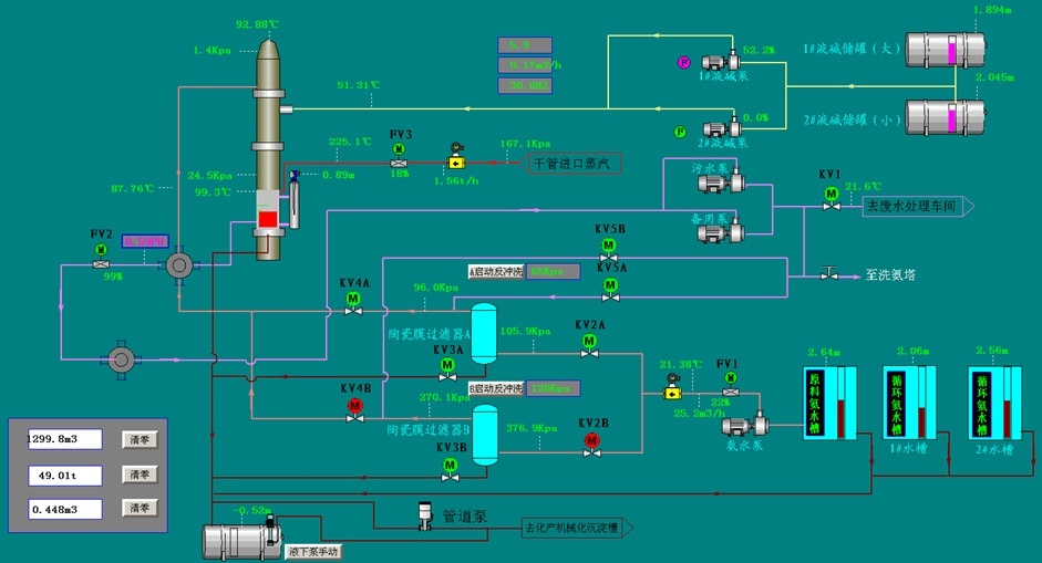 (1)陶瓷膜過(guò)濾器:,去除原料氨水中含有顆粒物及焦油類雜質(zhì),以防止負(fù)壓亞沸脫氨塔的堵塞。當(dāng)進(jìn)陶瓷膜過(guò)濾器管道的前后壓力差達(dá)到0.05~0.1Mpa時(shí)啟動(dòng)反沖洗程序,反沖洗的廢液排入液下槽后泵入化產(chǎn)車間機(jī)械化澄清槽。