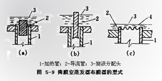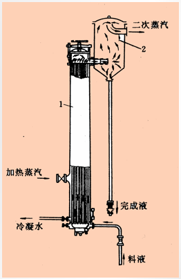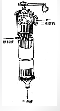 溶液預(yù)熱后由加熱室頂部加入,經(jīng)管端的液體分布器均勻分配在各加熱管內(nèi),在重力作用下沿管內(nèi)壁呈膜狀向下流動(dòng),并進(jìn)行蒸發(fā)。汽液混合物從管下端流出,在分離器內(nèi)進(jìn)行汽液分離后完成液由分離室底部排出。