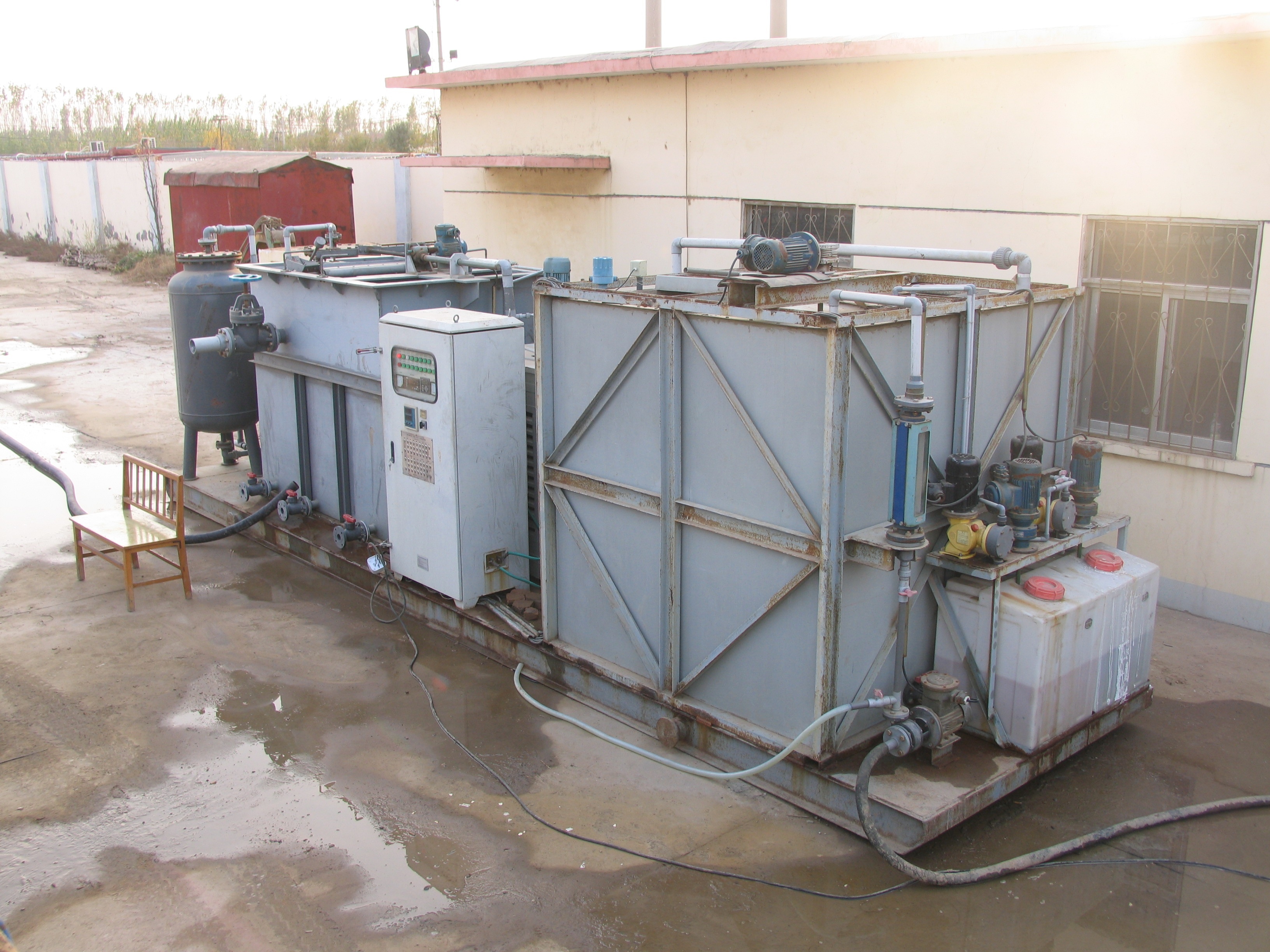 電解后的廢水經(jīng)加入絮凝劑后直接排入氣浮池,除了電解時(shí)產(chǎn)生的氫氣、氧氣外,氣浮池本身附有的艾杜爾氣液二相泵產(chǎn)生大量的微小氣泡,氣泡能氧化廢水中的有機(jī)物,又能把廢水中的雜質(zhì)托到頂部,由刮渣機(jī)刮去,然后再過(guò)一次強(qiáng)氧化系統(tǒng),清液泵入過(guò)濾系統(tǒng),第一組罐子是石英沙填料,第二組罐子是活性碳。按需要將管道聯(lián)接,適用于是否反沖洗。